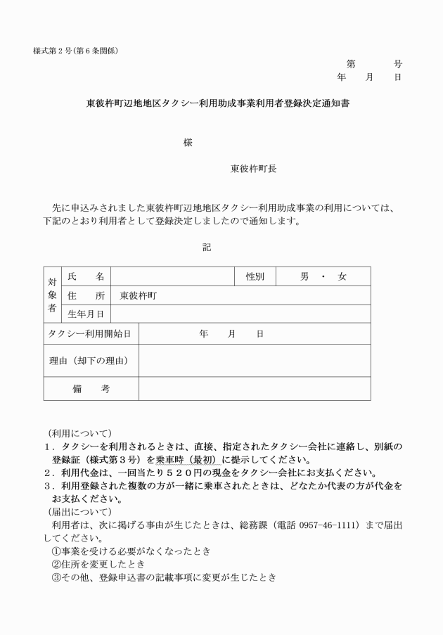 第5条 本事業を利用しようとする者は、タクシー利用助成事業利用者登録申込書(様式第1号)を町長に提出するものとする。