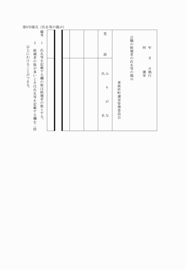 第7条 法第173条(公職の候補者の氏名等の掲示)第1項及び法第175条の2(投票記載所の氏名等の掲示)第1項の規定による氏名等の掲示の掲示様式は、別記第9号様式による。