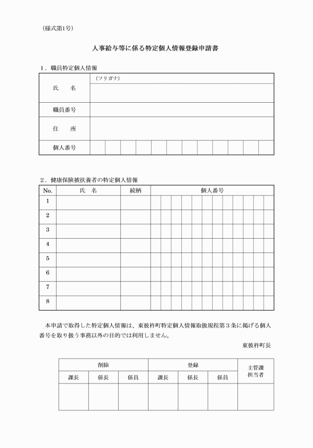 第1条 この規程は、行政手続における特定の個人を識別するための番号の利用等に関する法律(平成25年法律第27号。以下「番号法」という。)、行政手続における特定の個人を識別するための番号の利用等に関する法律施行規則(平成26年内閣府・総務省令第3号。以下「規則」という。)及び特定個人情報の適正な取扱いに関するガイドライン(行政機関・地方公共団体等編)(以下「特定個人情報ガイドライン」という。)に基づき、東彼杵町(以下「町」という。)の取り扱う特定個人情報の適正な取扱いの確保並びに特定個人情報の「取得」、「利用」、「保管」、「提供」、「開示、訂正、利用停止等」及び「削除・廃棄」の各段階における取扱方法等について定めることを目的とする。