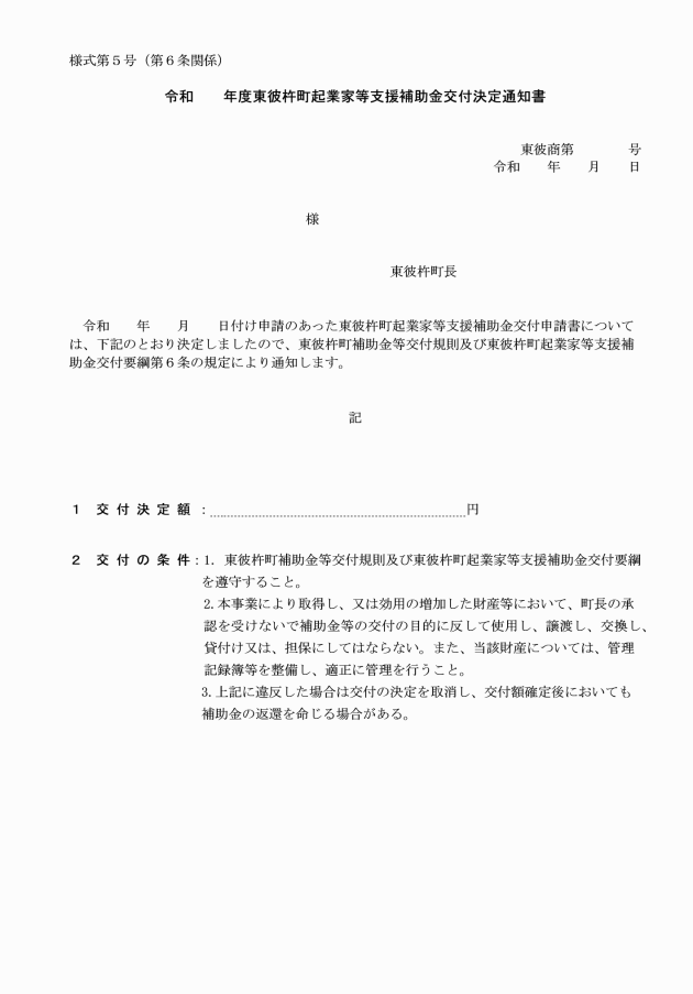 第6条 町長は、補助金の交付を適当と認めた時は、補助金交付決定通知書(様式第5号)により申請者に通知するものとする。