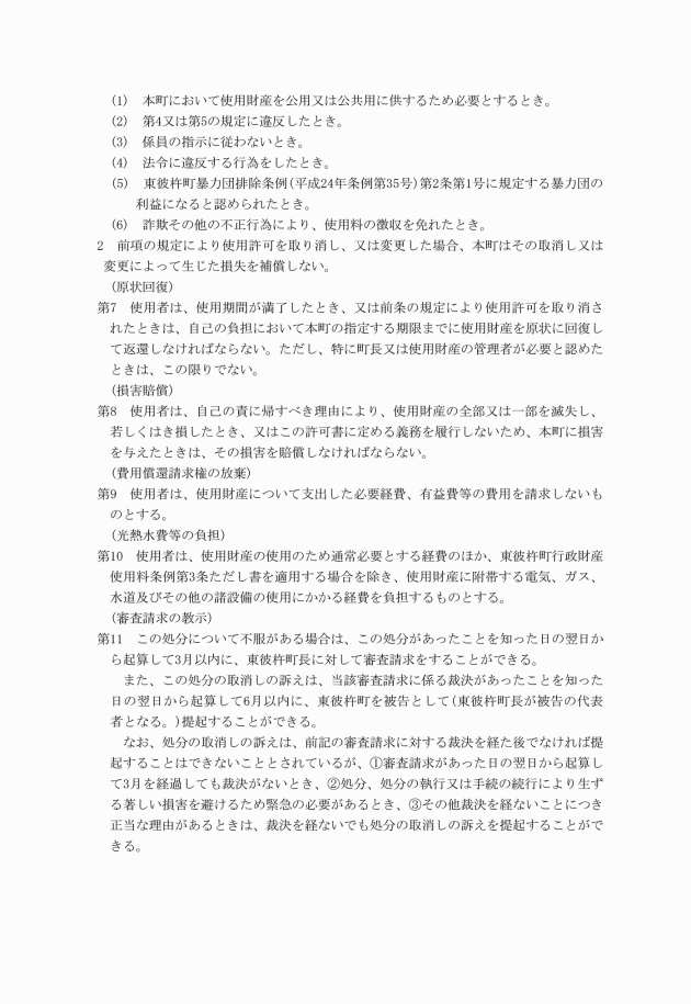 2 前項の許可をするに当たっては、使用者が当該行政財産を返還するときは、使用者の費用で原状回復又は撤去を行うべきことを条件とするものとする。