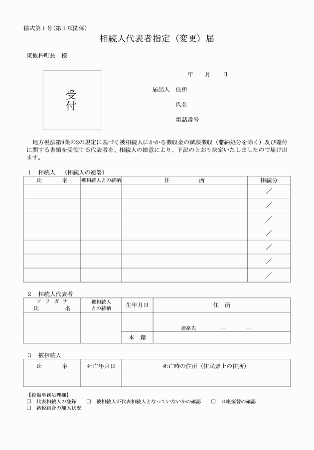 1 納税義務者が賦課期日以後(1月1日を含む。)に死亡した場合には、地方税法(昭和25年法律第226号。以下「法」という。)第9条第1項に規定する相続人又は相続財産法人(以下「相続人等」という。)に、法第9条の2第1項の規定により相続人代表者指定(変更)届(様式第1号)を提出するよう相続人等に通知依頼する。