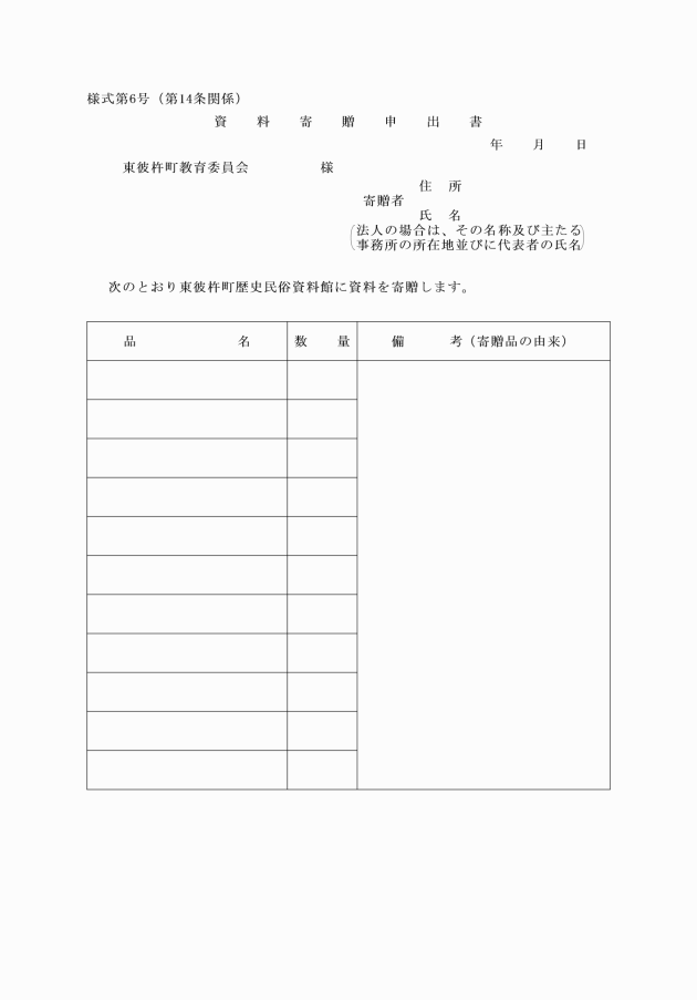 第7条 条例第8条の規定により、資料館の施設を使用しようとする者は、あらかじめ、東彼杵町歴史民俗資料館使用許可申請書(様式第1号)を教育委員会に提出しなければならない。