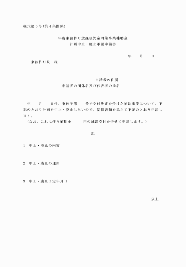 第5条 補助事業者は、東彼杵町放課後児童対策事業補助金実績報告書(様式第7号)に次に掲げる書類を添えて、翌年度の4月10日までに町長に提出しなければならない。