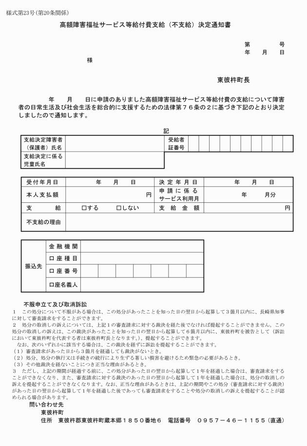 第20条 町長は、法第76条の2第1項に規定する高額障害福祉サービス等給付費の支給又は不支給の決定を行ったときは、高額障害福祉サービス等給付費支給(不支給)決定通知書(様式第23号)により、当該申請者に通知するものとする。