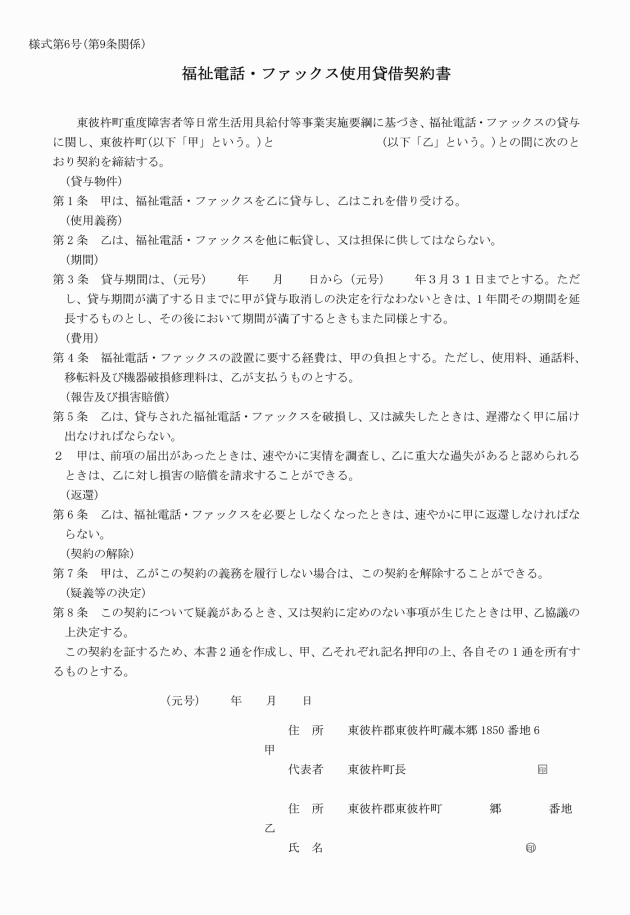 第9条 用具の貸与の決定を受けた者は、福祉電話・ファックス使用貸借契約書(様式第6号)によって町長と貸借の契約を締結し、用具の貸与を受けるものとする。