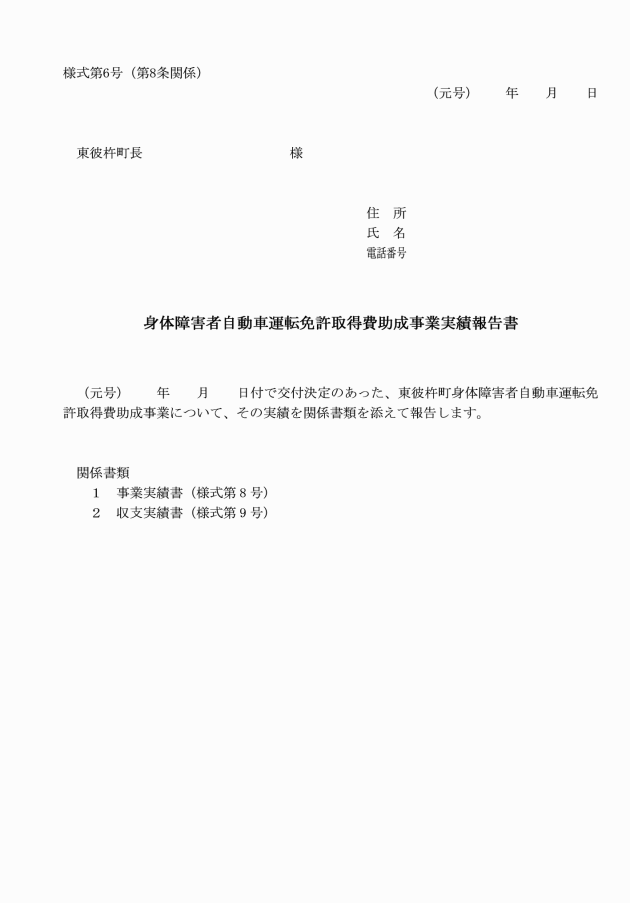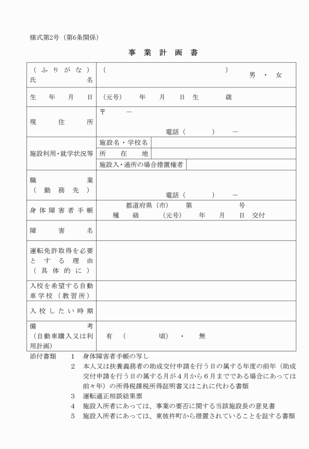 第6条 助成金の支給を受けようとする者(以下「申請者」という。)は、身体障害者自動車運転免許取得費助成申請書(様式第1号)に次に掲げる書類を添えて、町長に提出しなければならない。