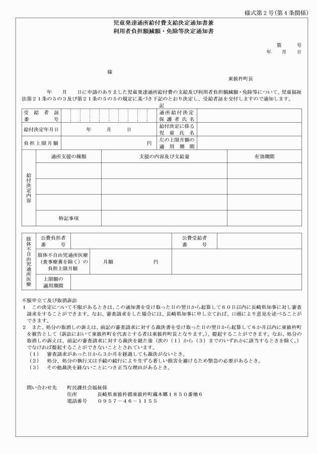 第3条 障害児通所給付費の支給決定を受けようとする障害児の保護者は、児童発達通所給付費支給申請書兼利用者負担額減額・免除等申請書(様式第1号)により町長に申請しなければならない。
