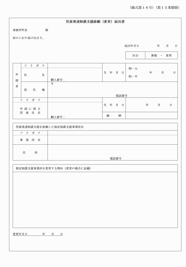 2 障害児の保護者が指定障害児相談支援事業者を決定し、又は変更するときは、児童発達相談支援依頼(変更)届出書(様式第16号)により町長に届け出なければならない。