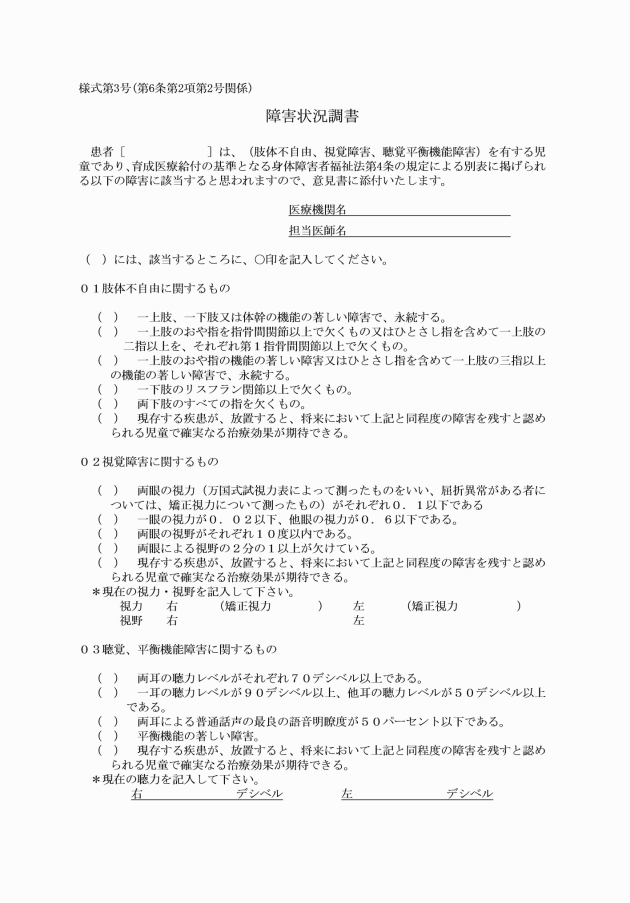 (2) 肢体不自由・視覚・聴覚、平衡機能障害に係る医療である場合は、障害状況調書(様式第3号)