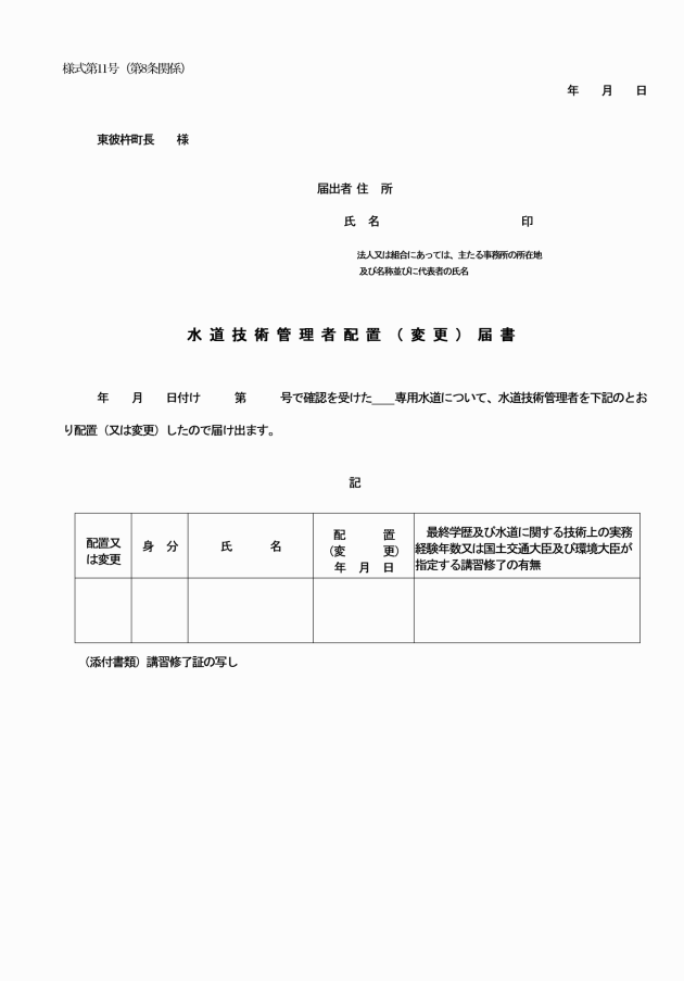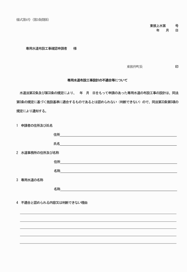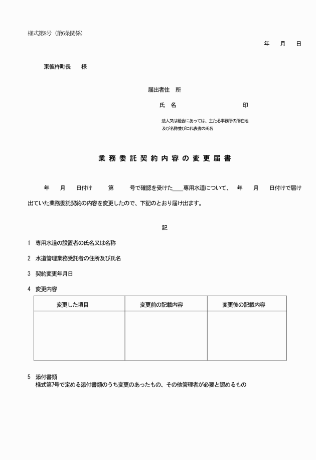 第4条 法第33条第3項の規定に基づく申請書の記載事項の変更の届出は、専用水道布設工事確認申請書記載事項変更届書(様式第5号)により管理者に届け出るものとする。