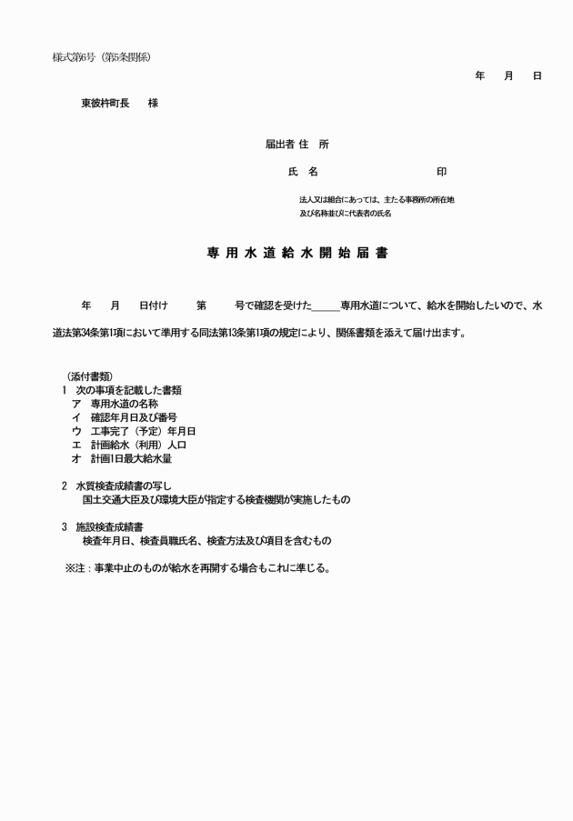 第5条 法第34条第1項において準用する法第13条第1項の規定に基づく専用水道の給水開始の前の届出は、専用水道給水開始届書(様式第6号)により管理者に届け出るものとする。中止した専用水道の給水再開の前の届出も、同様とする。