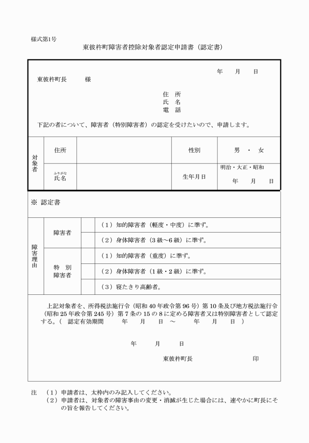 第6条 町長は、障害者控除の対象となる者の精神又は身体の障害の状況について審査し、障害者又は特別障害者に準ずると認めたときは、東彼杵町障害者控除対象者認定書(様式第1号。以下「認定書」という。)を交付するものとする。