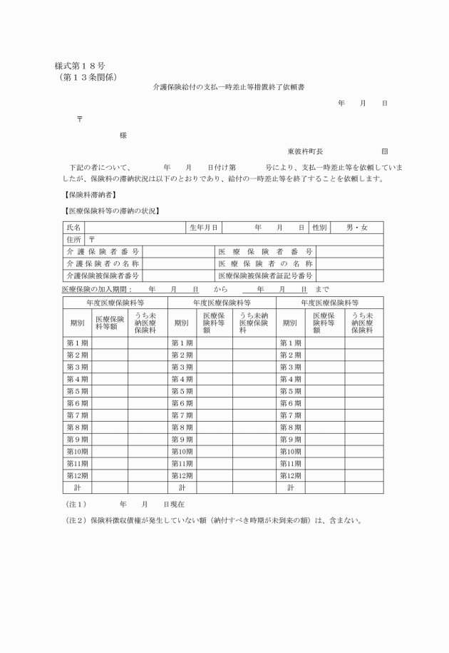 第13条 保険給付の支払一時差止等の適用を受けている者が終了を求める場合は、介護保険給付の支払一時差止め等終了申請書(様式第17号)を町長に提出するものとする。
