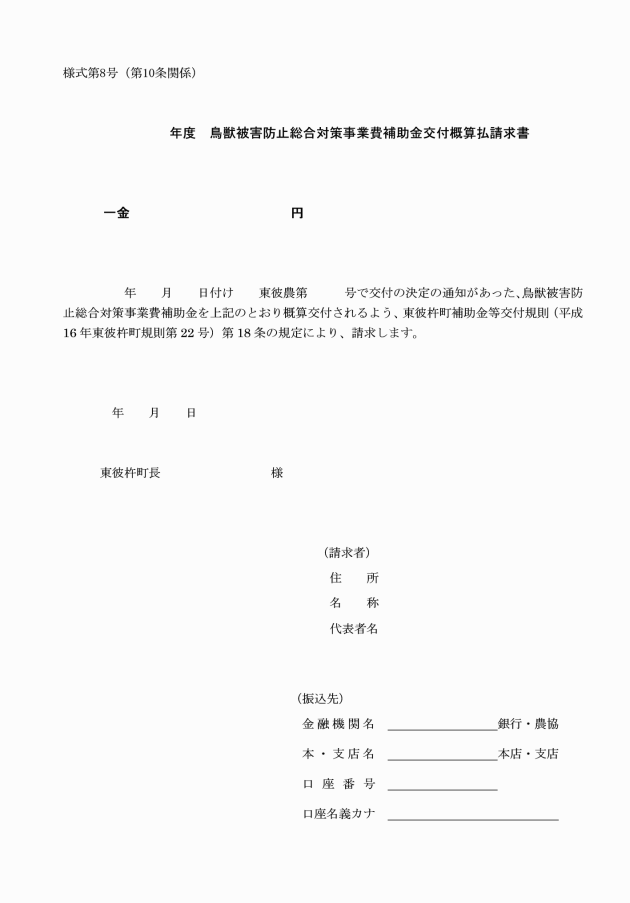 第10条 交付決定者は、補助金の概算払を受けようとするときは、鳥獣被害防止総合対策事業費補助金交付概算払請求書(様式第8号)を町長に提出しなければならない。