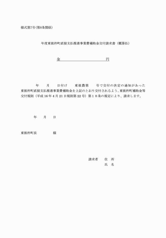 第7条 規則第6条第2項第1号の規定による事業計画変更の承認を受けようとする者は、東彼杵町直接支払推進事業費補助金変更承認申請書(様式第4号)を町長に提出しなければならない。