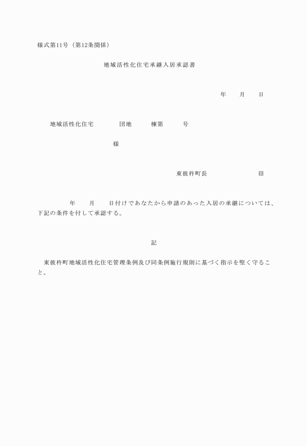 第17条 条例第23条第1項ただし書に規定する承認を受けようとする入居者は、地域活性化住宅模様替え(増築)承認申請書(様式第19号)に設計図及び仕様書を添え町長に提出しなければならない。