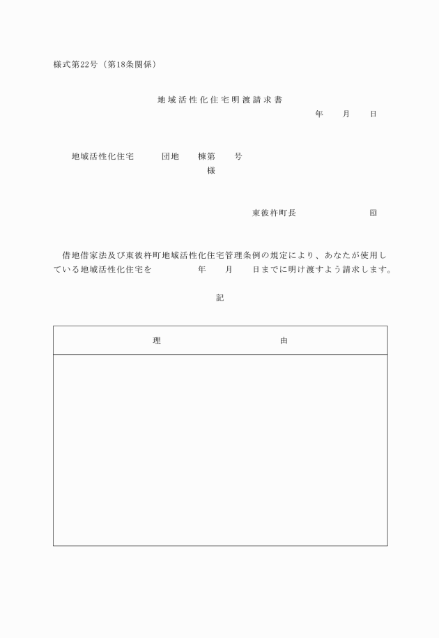 第10条 入居者は、当該住宅を明け渡そうとするときは退去日の14日前までに、地域活性化住宅退去届(様式第7号)を町長に提出しなければならない。