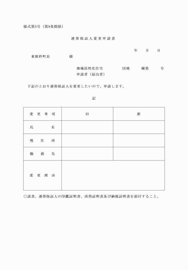 第9条 入居者は、条例第10条第1項第1号の規定により請書を提出した後、当該入居者に係る保証人の死亡又は辞任の申出等により保証人を変更しようとするときは、事由発生の日から10日以内に新たに保証人となる者を定め、連帯保証人変更申請書(様式第5号)を町長に提出しなければならない。
