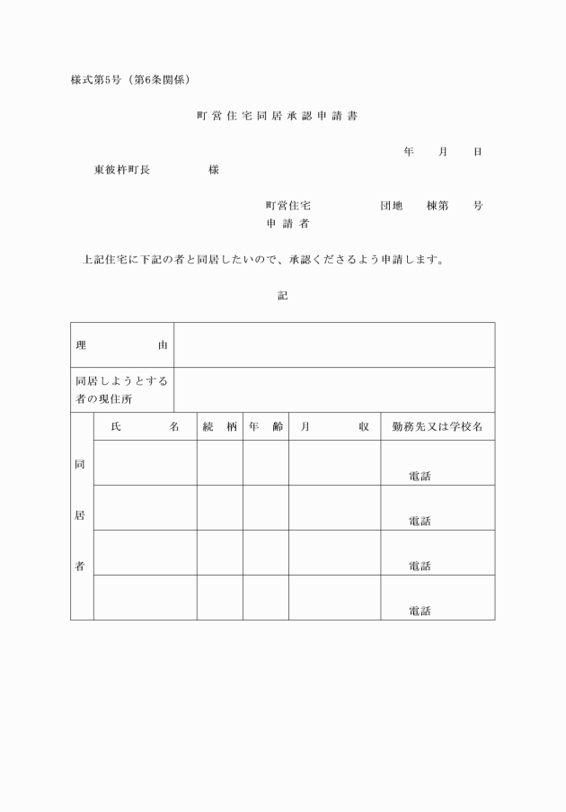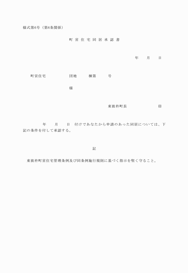 第12条 条例第27条ただし書に規定する承認を得ようとする入居者は、町営住宅併用承認申請書(様式第22号)を町長に提出しなければならない。