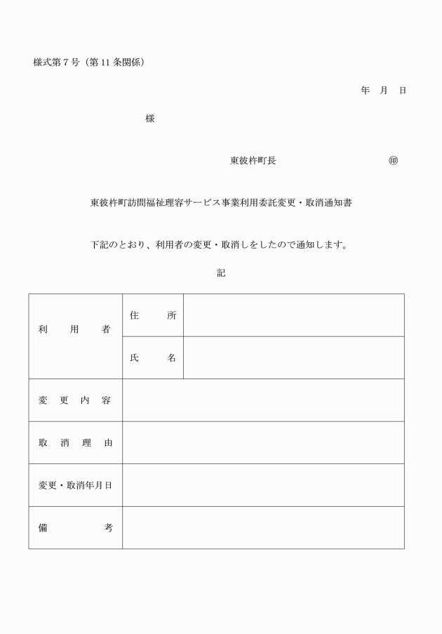 第5条 東彼杵町訪問福祉理容サービス(以下「サービス」という。)を受けようとする者(以下「申請者」という。)は、訪問福祉理容サービス事業利用申請書(様式第1号)を町長に提出しなければならない。