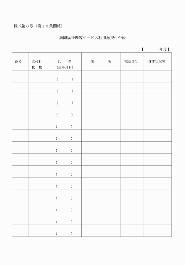 第13条 町長は、訪問福祉理容サービス利用券交付台帳(様式第8号)を備え、必要な事項を記載し、整理するものとする。