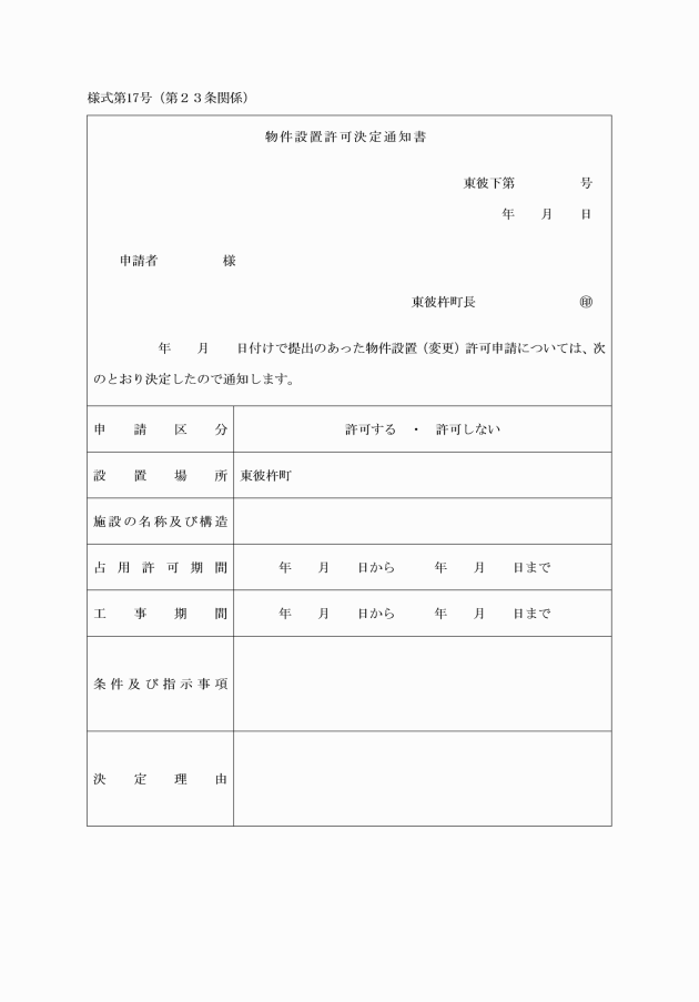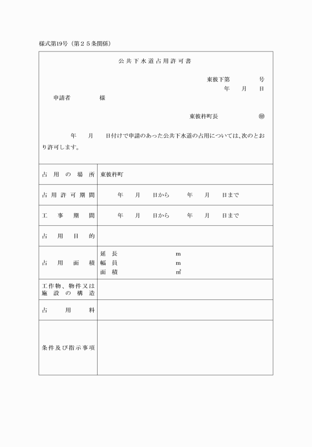 第25条 管理者は、占用の許可をしたときは、公共下水道占用許可書(様式第19号)を交付するものとする。
