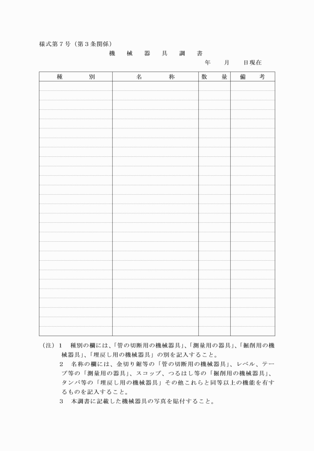 (6) 工事の施工に必要な機械器具設備の調書(様式第7号)並びに写真