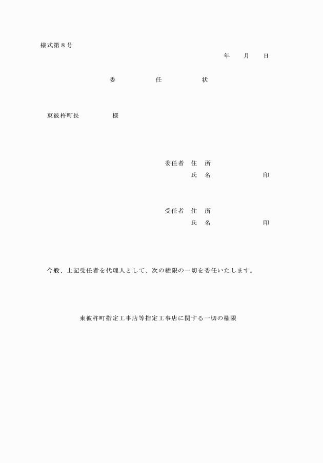 第3条 指定業者の指定を受けようとする者は、東彼杵町排水設備工事指定業者申請書(様式第1号。以下「指定申請書」という。)に次に掲げる書類を添えて管理者に提出しなければならない。