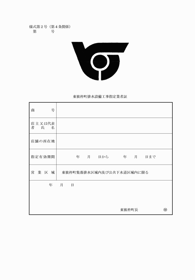 第4条 管理者は、指定業者としての指定をしたときは、東彼杵町排水設備工事指定業者証(様式第2号。以下「指定証」という。)を交付する。