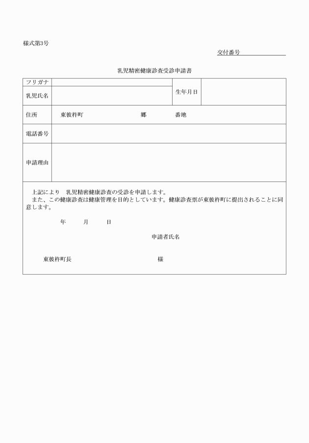2 一般健康診査の結果、医師が精密健康診査を必要と認めた乳児は、乳児精密健康診査受診申請書(様式第3号。以下「精密健康診査申請書」という。)を町長に提出するものとする。