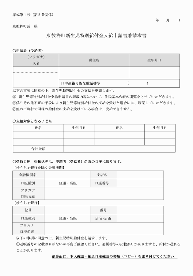 第5条 給付金の支給を受けようとする者は、東彼杵町新生児特別給付金支給申請書兼請求書(様式第1号)を町長に提出しなければならない。